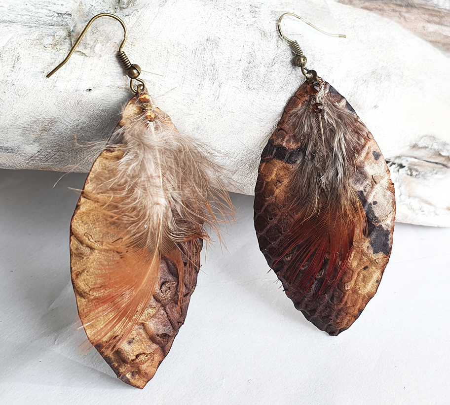 A függő fülbevaló egy barna python mintás bőrből és egy érdekes mintázatu kis tollbol áll.