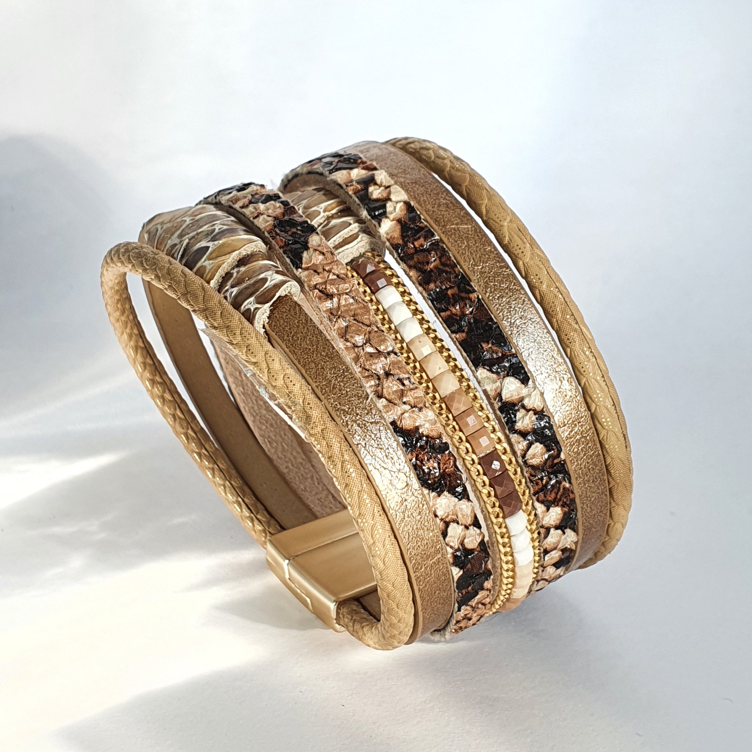 A bordó többzsinóros karkötőt egzotikus bőr, hengerbőr, strasszos csík, valamint 3 színű nemesacél fémköztes díszíti.