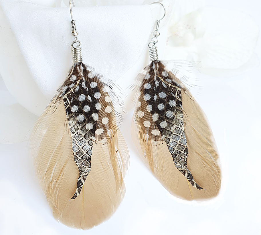 A drapp kígyóbőrrel díszitett maddártoll, egy különleges pöttyös gyöngytyúktoll és egy kígyóbőr diszitést kapott, mely igazán különlegessé teszi a fülbevalót.