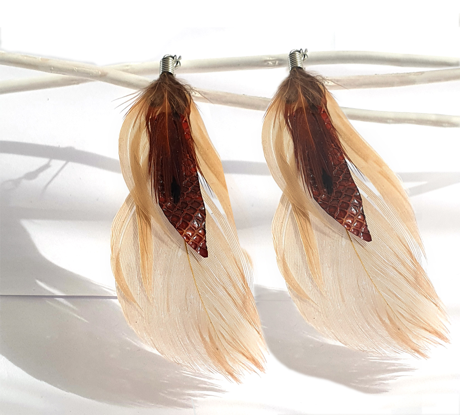 Drapp női toll fülbevaló vörös kígyóbőrrel