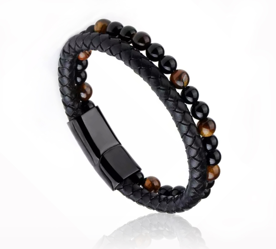 A karkötő fonott fekete 5mm-es kiváló minőségű bőrből és 5 mm-es tigrisszem ásványból áll.