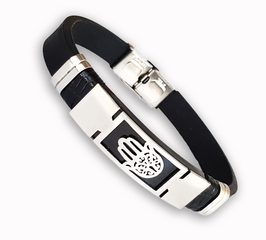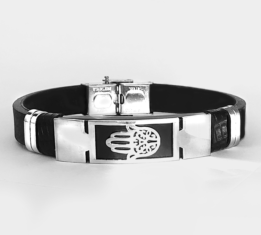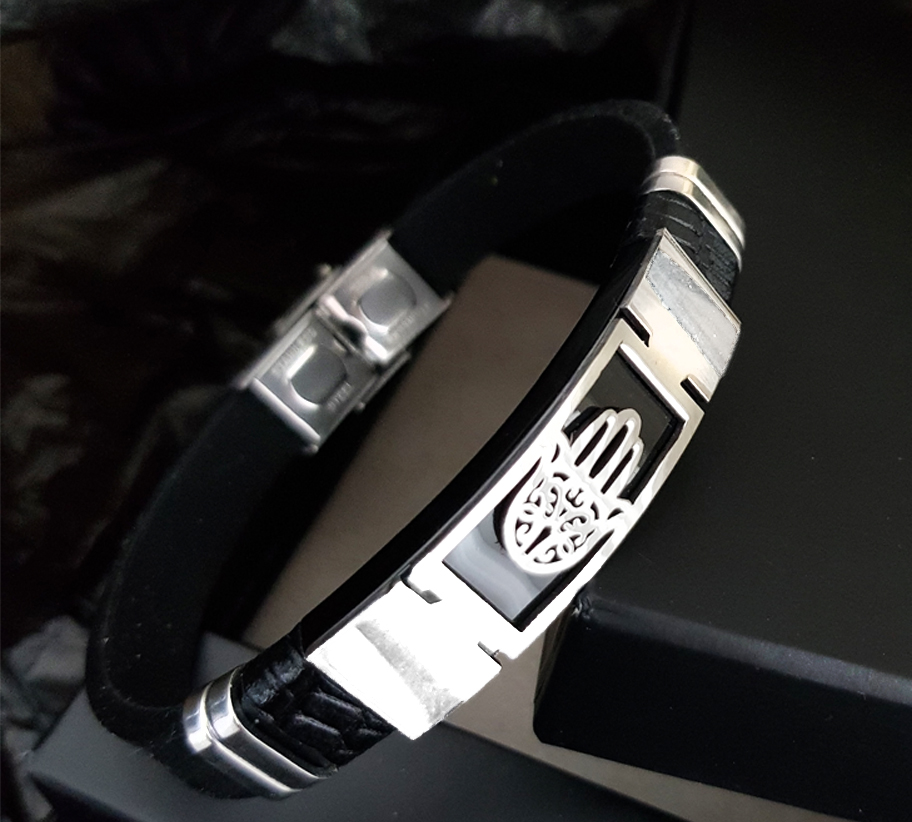 Talizmánként használják,védelmi szimbólum,a gonosz szem ellen hordják ékszerként. A karkötő kaucsuk alapanyagú zsinórból áll, melyen nemesacél fatima kéz köztes van. A nemesacél köztes két szélén egzotikus bőr díszités van.