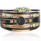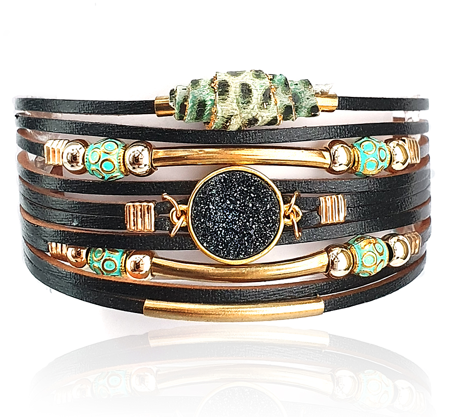 Elegáns, dekoratív darab! A karkötő 10 sávos fekete zsinór egyveleggel pompázik. Az apró türkiz és arany fémgyöngyök , az arany színü fémköztesek ,valamint a vékony fekete bőrszálak kellemes színösszhangot teremtenek. A karkötő közepén lévő csillogó lávakő berakást kétoldalt festett zöld rájamintás bőr teszi még különlegessé,kiemelve a karkötő eleganciáját. A karkötő vége arany színü mágneszárral csatolódik. Karkötő mérete: 3×19,5 cm. A karkötőt ajándék dísztasakban szállítom.