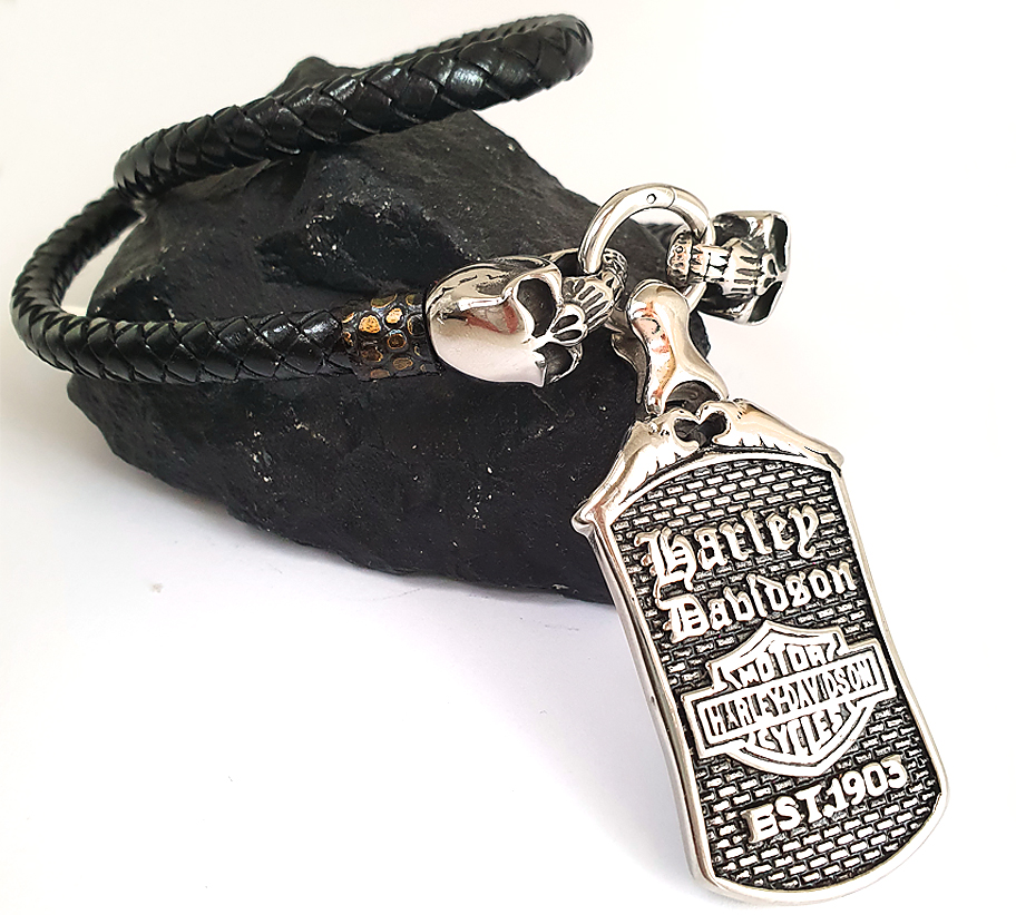 A két skull koponya kerek rugós kapcsot fog közre, melyen egy stílusos Harley Davidson igényesen kidolgozott medál van.