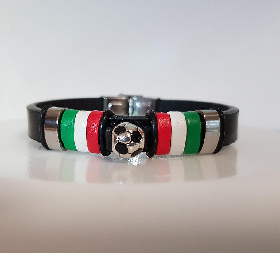 A bőr karkötőn nemesfém 1 cm-es labda van. Magyar válogatott  jelzésü.
