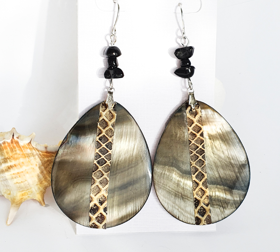 A hosszában futó bőr , majd a felette lévő fekete ásvány kellemes színösszhangot ad a fülbevalónak. Egyszerü, mutatós darab.