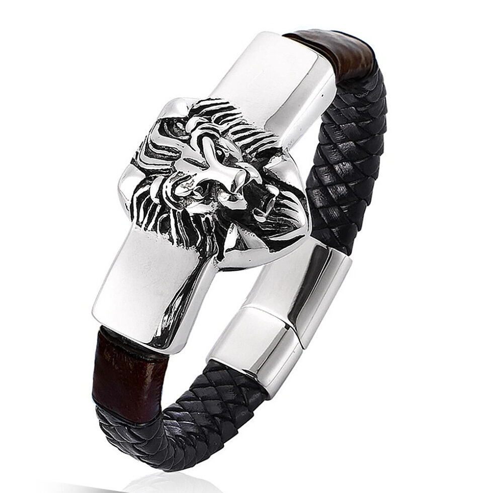 A karkötő elején nemesacél oroszlánfej motívum van, mely 4 cm. A 316L orvosi acél nem szineződik, antiallergén.