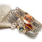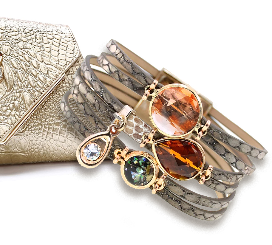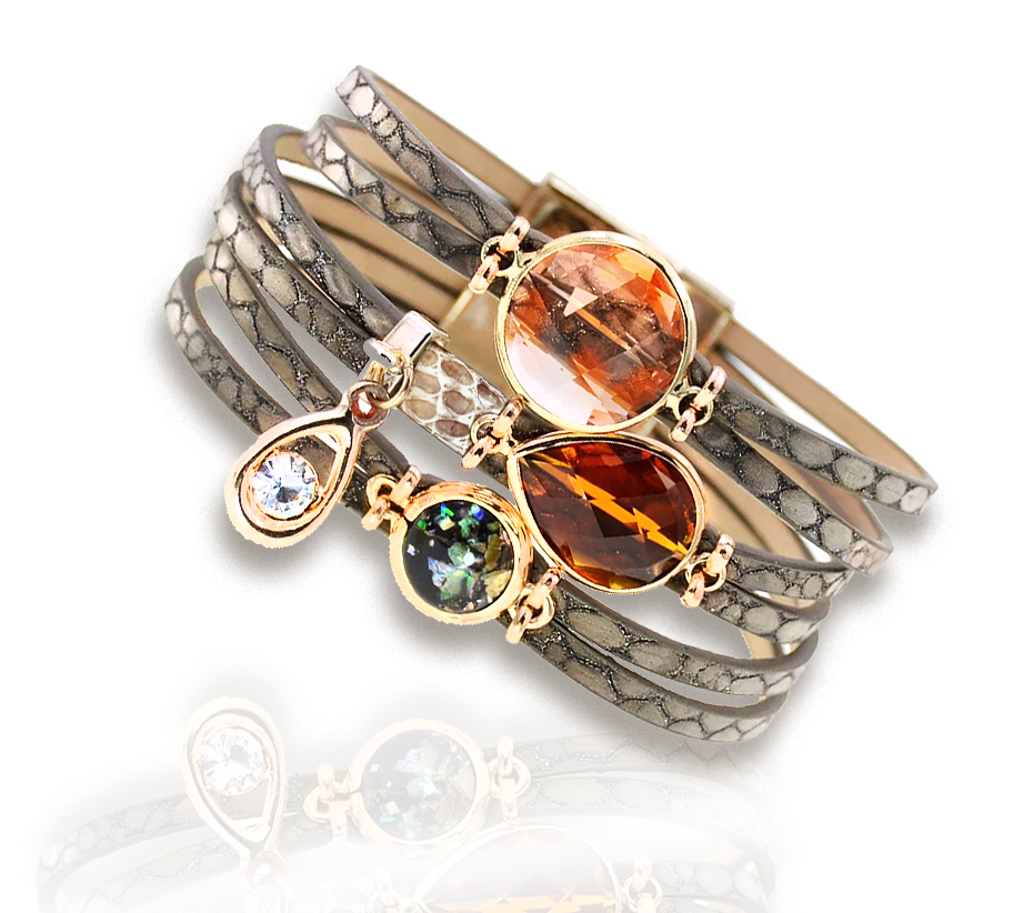 A karkötő 6 sávos metálfényes sötétszürke zsinór egyveleggel pompázik. Az arany színü alapban lévő fazettált kövek látványossá teszik a karkötőt. A karkötő közepén a kígyómintás bőr mellett egy cirkonia köves charm van. A karkötő vége arany színü mágneszárral csatolódik.