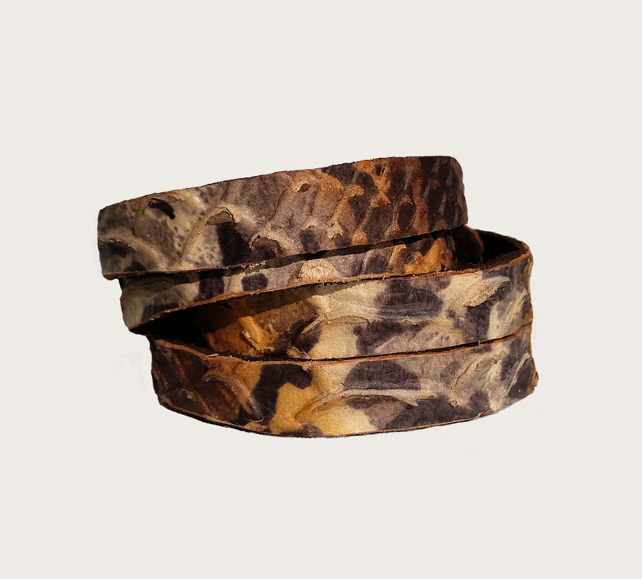 [ps_tcontent class=”active” id=”ps_first_tab60″]A karkötő marhabőr alapon python mintával nyomott. A karkötő különlegessége a kétsoros bevágott rész. A karkötőt kétszer lehet feltekerni a csuklóra. Valódi bőrrel van bélelve. Hátsó része patenttal záródik.[/ps_tcontent]