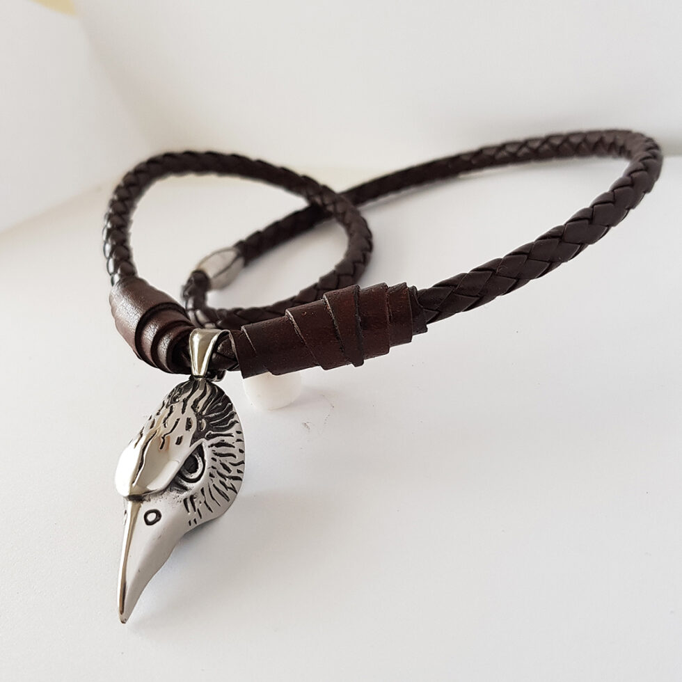 A barna fonott bőr nyakláncot szinben harmonizáló barna bőrgyöngy disziti.Vége nemesacél kapoccsal záródik.