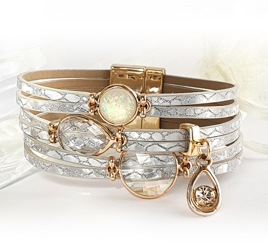 A karkötő 6 sávos metálfényes ezüstszürke zsinór egyveleggel pompázik. Az ezüst színü alapban lévő fazettált kövek látványossá teszik a karkötőt. A karkötő közepén egy cirkonia köves charm van. A karkötő vége ezüst színü mágneszárral csatolódik.
