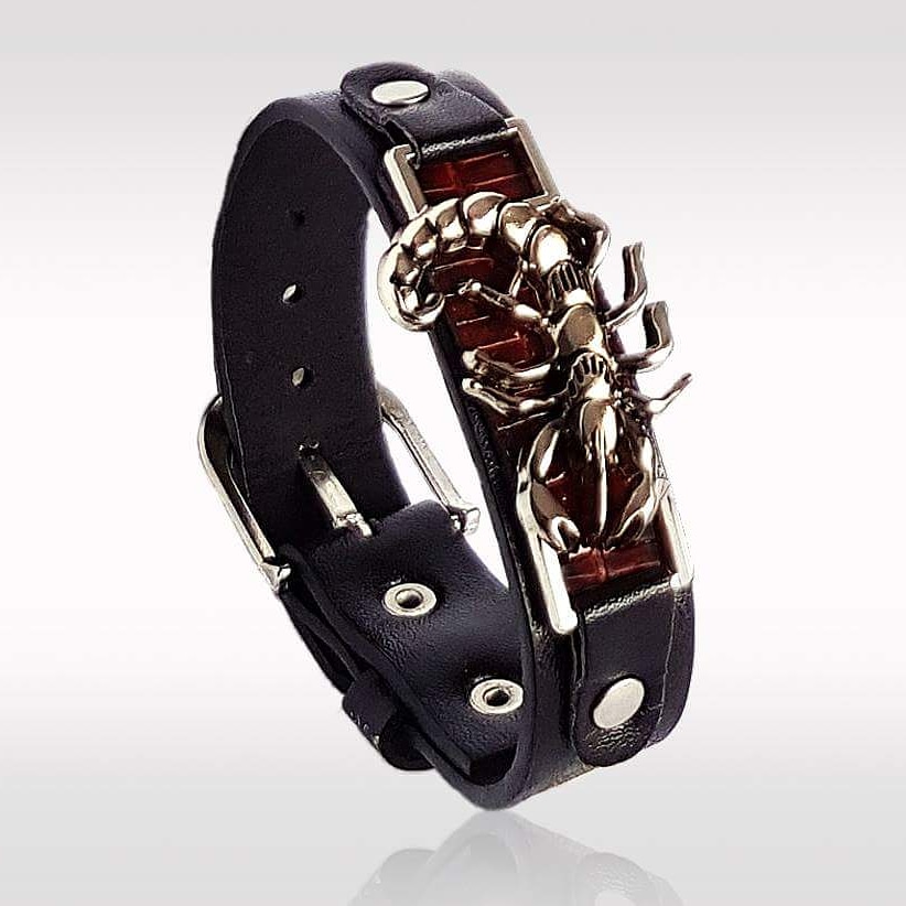 Nemesacél karkötő,bőr pántos, nemesfém skorpió díszítéssel.A kskorpió minta alatt krokodilnyomott sertésbőr van. A karkötőn szegecsek vannak.