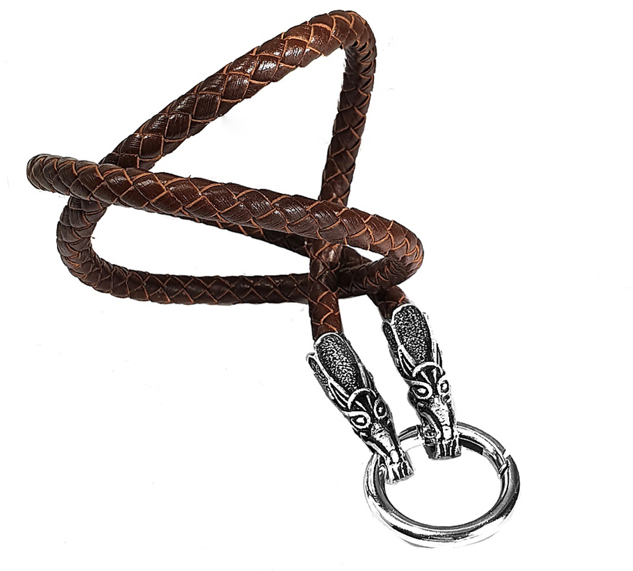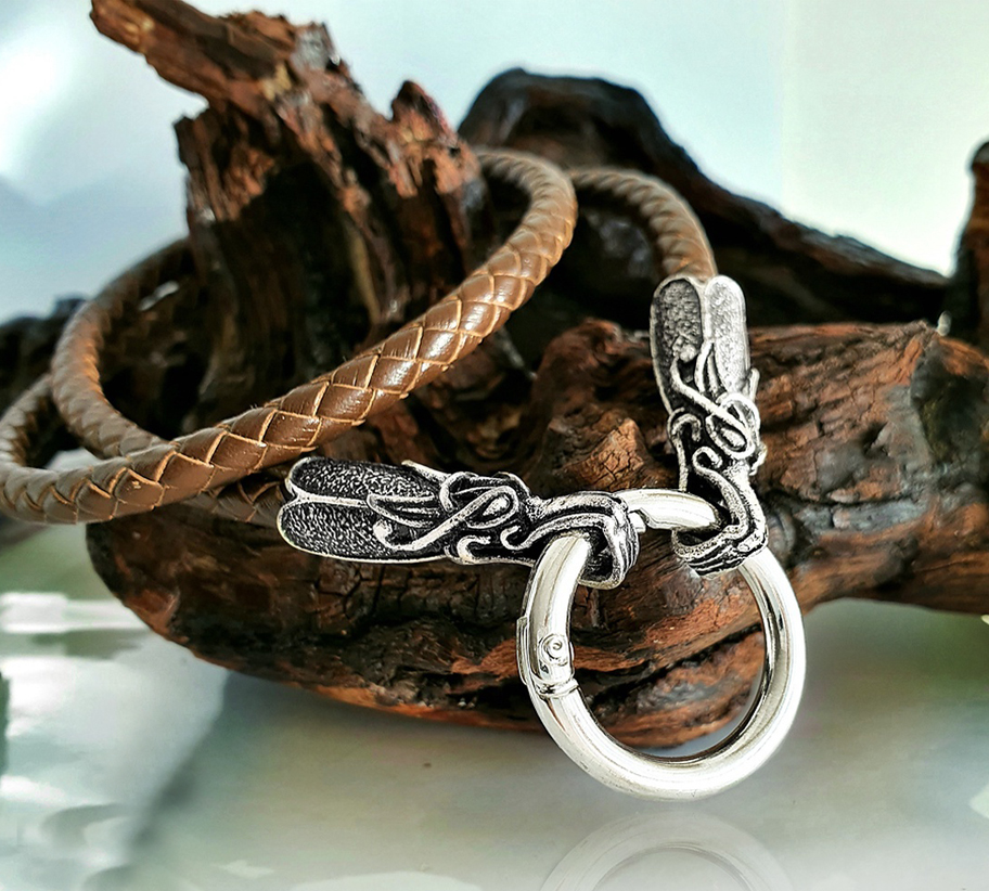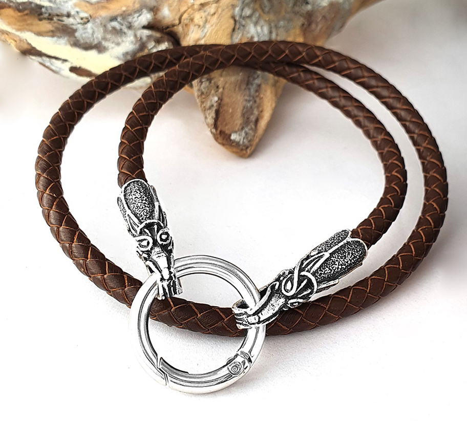 A fonott magas minőségű marhabőr zsinór végén két sárkányfej van, mely karikára harap. Ez adja a nyaklánc záródását is. A karikába medált lehet rakni.