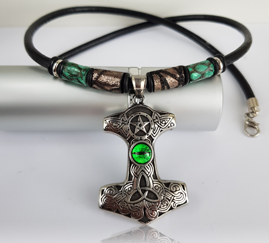 A kelta romantikus csomós motívumokkal vésett medálon a zöld szem és a fekete 4mm-es hengerbőr zsinóron lévő zöld python bőrgyöngy fantasztikus párosítás! Thor mitikus kalapácsát idézi, és a benned rejlő erőt szimbolizálja. Amulettként is hordható! Mjölnir a skandináv mitológiában Thor villámisten ősi fegyvere volt.