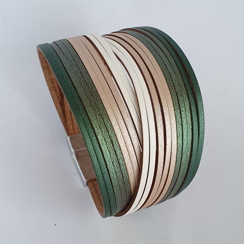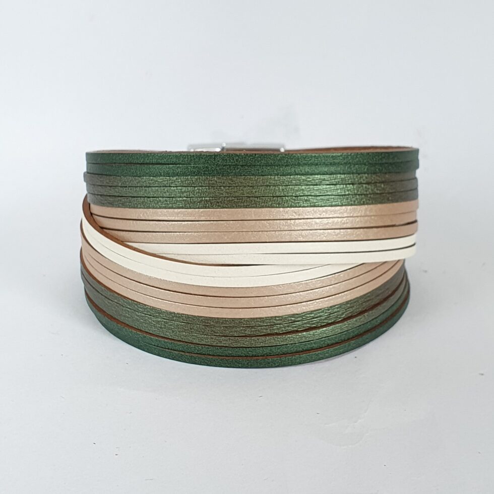 Zöld szinü többszálas karkötő,melynek közepéndrapp és fehér szál van.